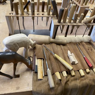 Alles begint met het tekenen van een ontwerp en het vertalen van het ontwerp naar het werkstuk. Afhankelijk van de gekozen houtsoort ga je vervolgens aan de slag met de juiste hamers, beitels, gutsen, vijlen en raspen.