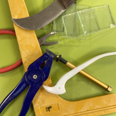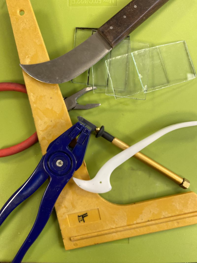 Uiteraard zijn er de noodzakelijke handgereedschappen voorhanden (glassnijders, loodhamers etc), slijpmachines.